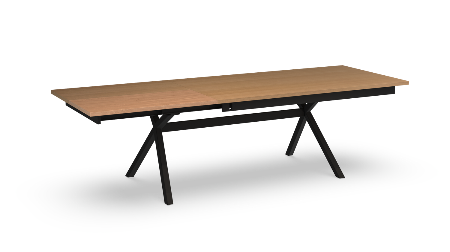 Breng flexibiliteit en stijl in je eetkamer met de Jura verlengtafel 180–280 cm. Het massief eiken blad straalt natuurlijke robuustheid uit, terwijl de zwart metalen sokkel een moderne, stoere touch toevoegt.
