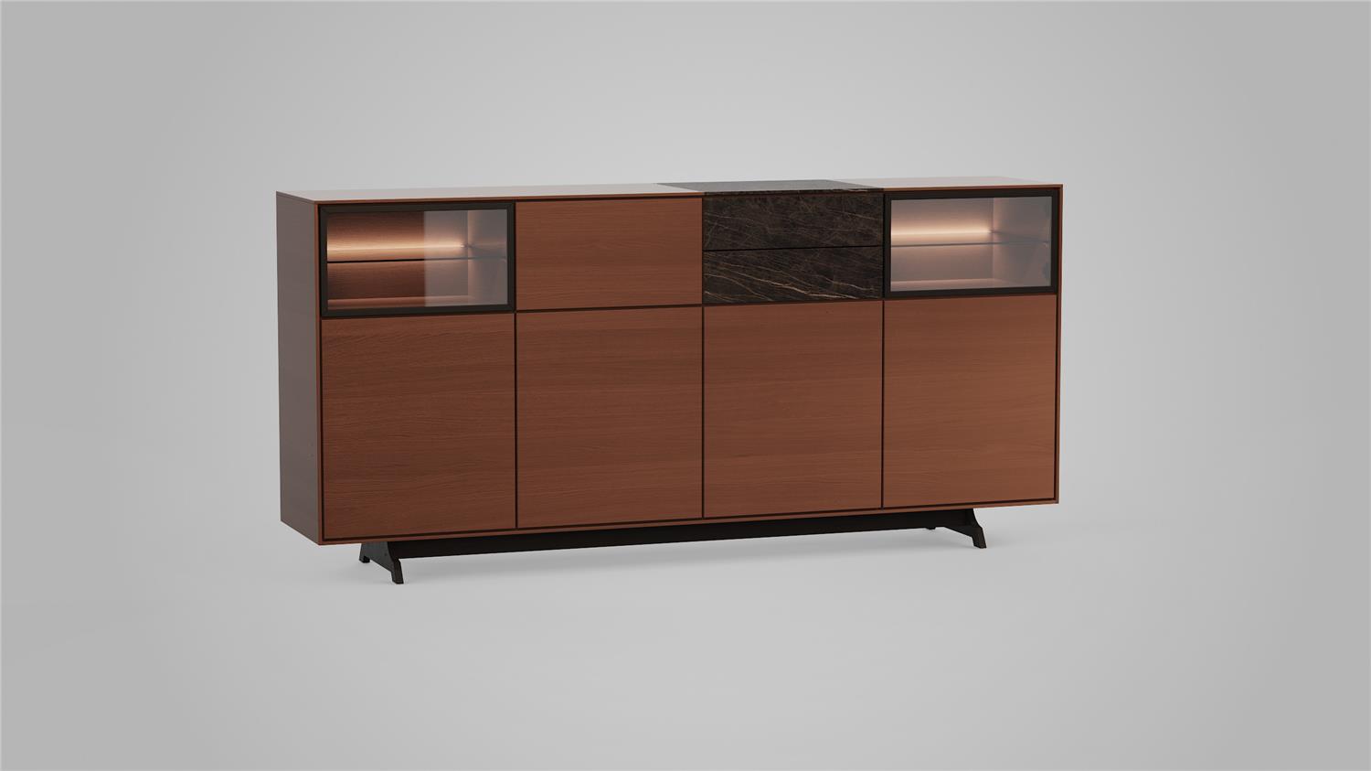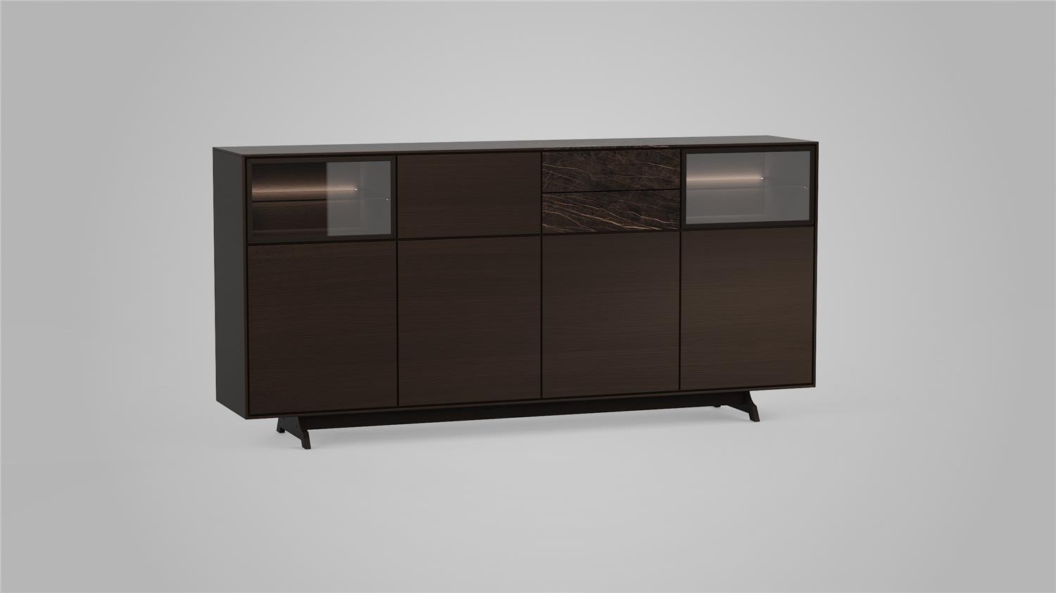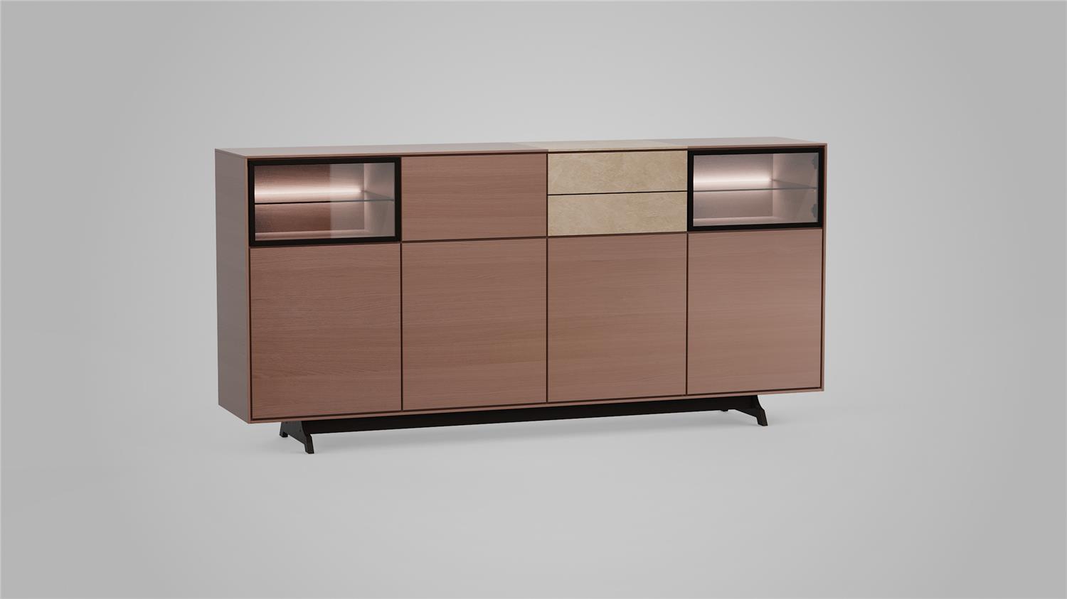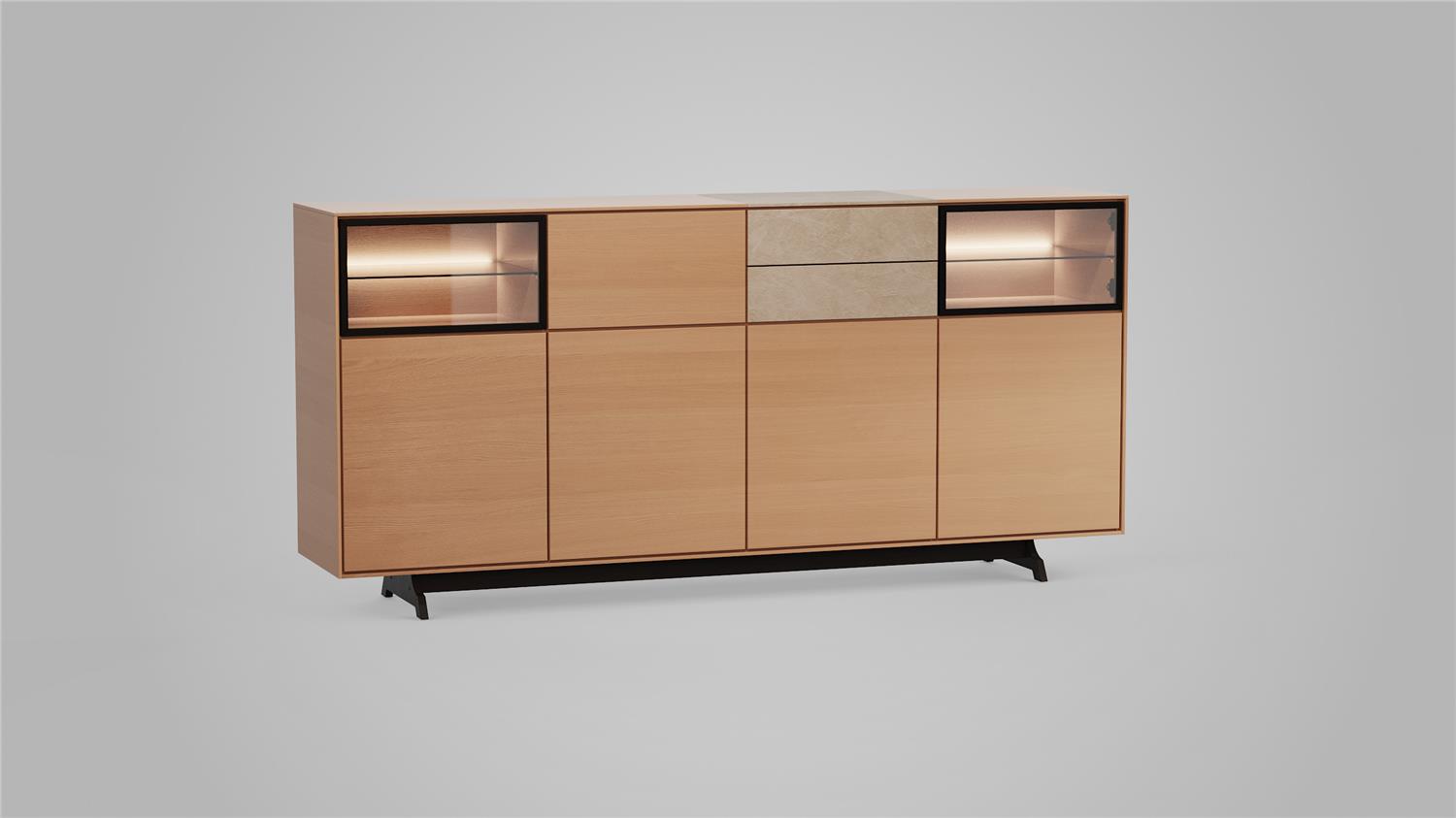 De collectie omvat hoge en lage dressoirs, berg- en vitrinekasten en tv-meubels – allemaal ontworpen met oog voor detail en functionaliteit. Dankzij de keuze uit vier verfijnde beitskleuren, van licht tot donker, creëer je moeiteloos de sfeer die bij jouw woonruimte past.