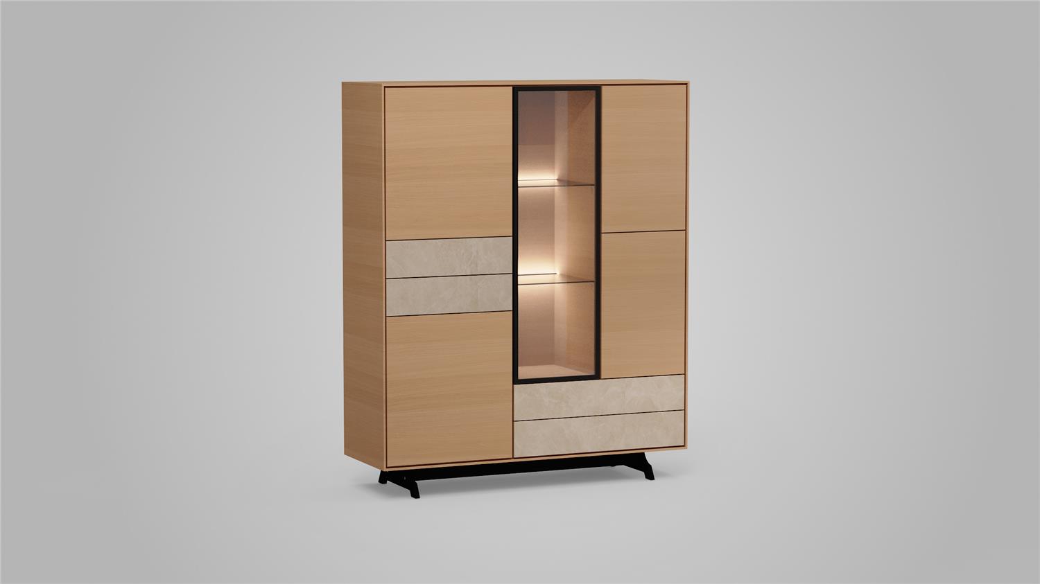 De collectie omvat hoge en lage dressoirs, berg- en vitrinekasten en tv-meubels – allemaal ontworpen met oog voor detail en functionaliteit. Dankzij de keuze uit vier verfijnde beitskleuren, van licht tot donker, creëer je moeiteloos de sfeer die bij jouw woonruimte past.